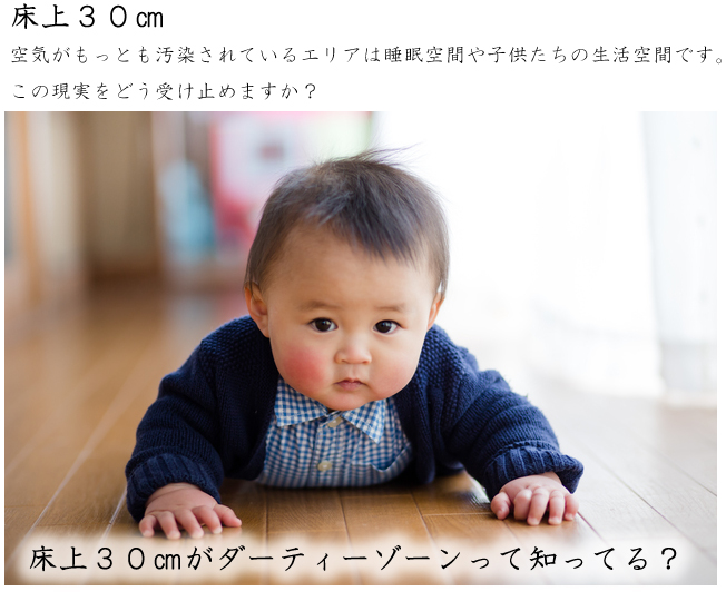ハウスダストなどのアレルギー物質は重力で床面付近に多く沈殿しています。